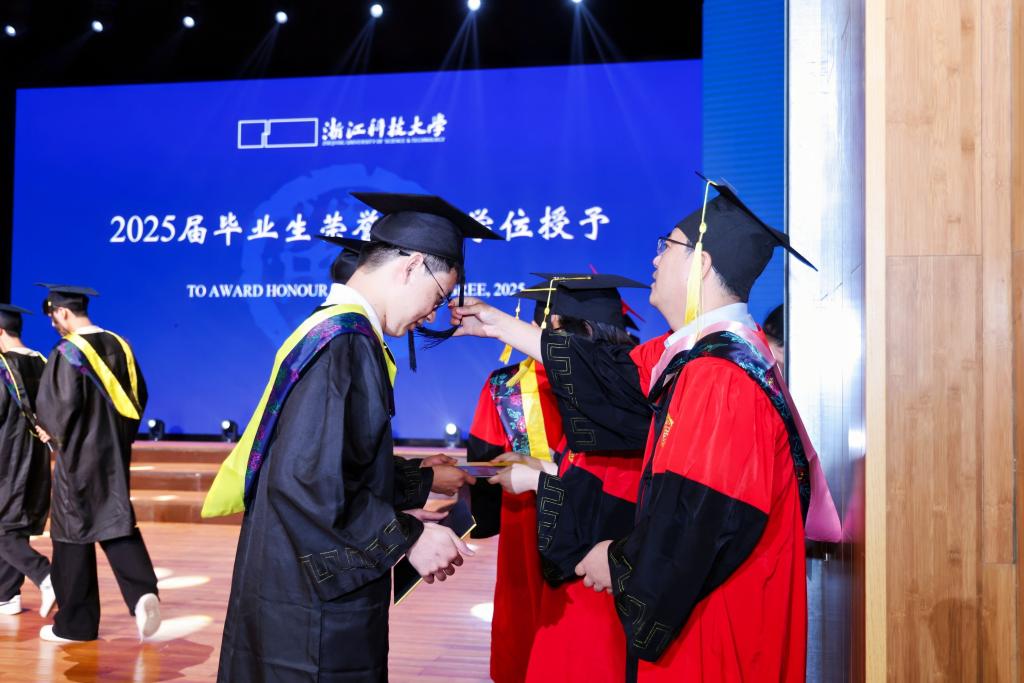 校党委书记赵东福、校长陈建孟共同为省级、校级优秀毕业生代表颁发荣誉证书,为毕业生代表颁发校训纪念章,为获得2025年卓越学子奖学金获奖学生颁奖。校党政班子成员为毕业生代表颁发学术诚信荣誉证书,为校友联络员代表颁发聘书。